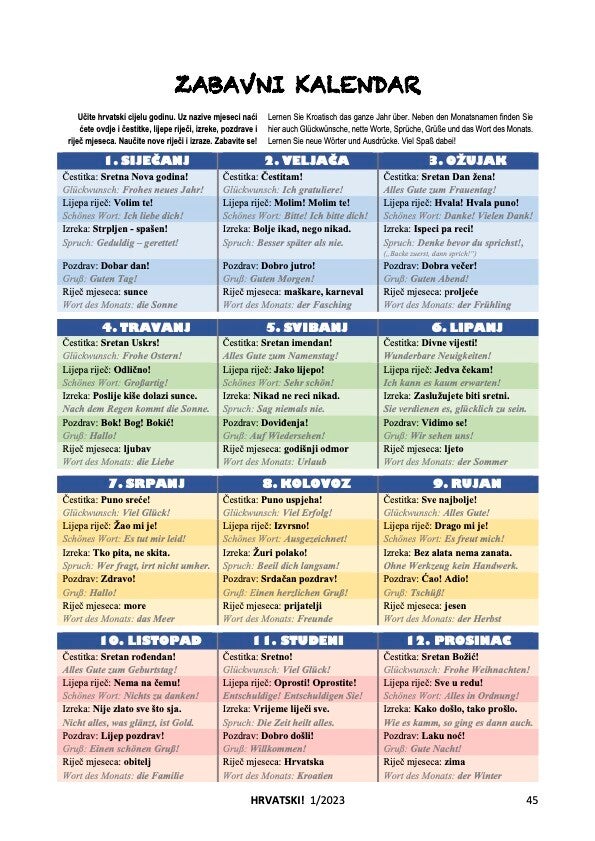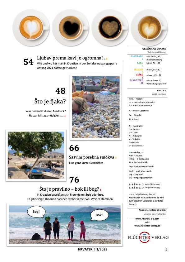 Die Sprachzeitschrift HRVATSKI! enthält auf 80 Seiten interessante Artikel zu Themen aus Sprache, Kultur, Gesellschaft, Alltag und Kulinarik Kroatiens. Sie ermöglicht Ihnen, die kroatische Sprachkenntnisse auf unterhaltsame Weise zu erweitern und das kroatische Lebensgefühl mitzuerleben. Mit Vokabellisten unmittelbar neben dem Artikel wird das Lesen und das Lernen erleichtert, da Sie im Text unterstrichene Worte nicht suchen müssen. Die unterstrichenen Worte befinden sich nämlich gleich neben oder unter dem Artikel übersetzt in die deutsche Sprache. Die Wörter in den Vokabellisten sind zusätzlich mit der langen oder kurzen Betonung gekennzeichnet, da das Erlernen des richtigen Akzentes im Kroatischen sehr wichtig ist. Sie verlieren damit keine Zeit die Vokabeln und die richtige Betonung zu suchen. Mit unterhaltsamen Übungen zu Grammatik, Wortschatz und Vokabeln können Sie Ihre Sprachkenntnisse testen