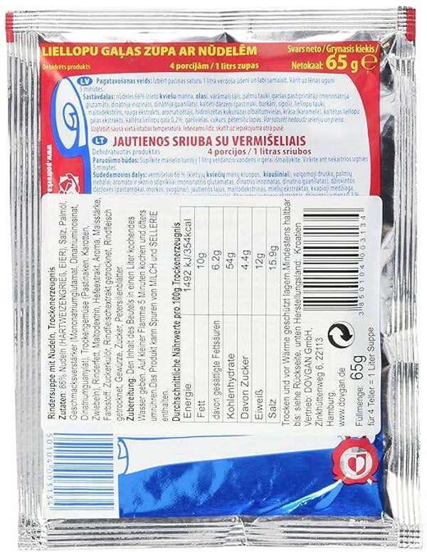 Zutaten: 66 % Nudeln (Weizenmehl, Eier), Speisesalz, gehärtetes Pflanzenfett, Geschmacksverstärker (Mononatriumglutamat, Dinatriuminosinat, Dinatriumguanylat), Rinderfett, Trockengemüse (Pastinak, Karotte, Zwiebel), Zucker, Hefeextrakt, hydrolysiertes Pflanzenprotein, Farbstoff (einfache Zuckerkulör), Aroma, Rindfleischextrakt getrocknet, 0,5 % getrocknetes Rindfleisch, Gewürze, Petersilienblätter, Maltodextrin. Kann Spuren von Sellerie und Milch enthalten.